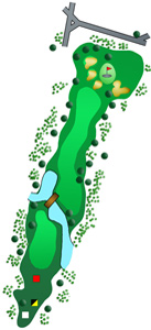 Diese Bahn hat es wirklich in sich. Ein Bachlauf der sich diagonal durch das Fairway erstreckt und am linken Fairwayrand in einem kleinen Teich mündet. Ist man vom Abschlag aus "trocken" geblieben, ist die Bahn noch lange nicht zu Ende. Das Grün wird vorne von mehreren Topfbunkern der Kategorie "British Open" bewacht. Der starke Abhang rechts hinter dem Grün verzeiht bei zu lang geratenen Schlägen ebenfalls keine Fehler.
