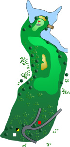 Aufgrund des großen Bunkers mitten in der Spielbahn muss die Taktik hier schon gut ausgetüftelt sein. Das Grün wird an drei Seiten von Wasser bewacht und muss im Flug angespielt werden.